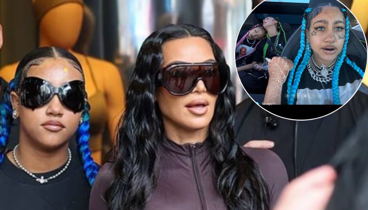 Kim’s daughter, whom she shares with her ex-husband, Kanye West, has a distinct fashion sense that leans towards being edgy and experimental. She shared a video of herself and her friends flying out for a concert with fake tattoos, nose piercings, a tooth grill, and coloured contacts.